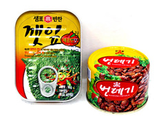 携带方便的迷你罐头类食品也多种多样,这些当然也属于韩国的特色食品。如腌制的苏子叶、添加了辣椒制作的香辣金枪鱼、韩国人常爱吃的斯帕姆午餐肉(Spam)等,都颇具人气。 | ||||||