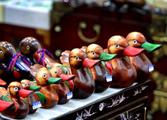木工艺品自古以来便与人们的生活息息相关,常见的有将军标和鸳鸯等形状的摆件。将军标是放置在村口的一对男女木像,主要是作为驱病除鬼的守护神之用。其身躯部分刻有“天下大将军”“地下女将军”等字样,滑稽的表情让人忍俊不禁。将军标的小型摆件可在纪念品商店购买。木鸳鸯摆件则象征着夫妻美满,常常装饰于传统婚礼的仪式中,也有很多朋友将此作为馈赠亲友的礼物。 | ||||||