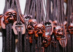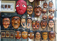木雕的面具“假面”是由过去用于假面剧这项传统曲艺的木制品演化而来,它造型诙谐,是广受游客们喜爱的工艺品之一。假面主要根据人类的面部表情设计而来,出场人物姿态及蕴含意义的不同,呈现出的表情也各有差异。为了象征性的表现人物的形象,通常会在眼、鼻、口等处使用夸张且浓厚的色彩加以修饰。“假面”这类传统木工艺品中极具代表性的种类便是河回假面了,它兴盛于庆尚北道安东地区的河回地域。河回假面特征明显,从嘴角部分将整个面部划分为上下两半。如果您想购买木工艺品,那么请您来观光胜地的纪念品商店中看一看,这里有以河回假面为主题设计的钥匙扣、徽章等众多小饰品。 | |||||||