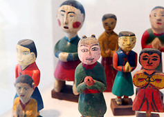 朝鲜时代土葬文化盛行,人们将装饰在搬运死者的轿子“丧轿”上的木刻人偶称为“木人”。木人多种多样,如骑在虎、马上的人物,或是龙、凤造型等,装饰木人目的是为了在给死者送别时让死者不感到寂寞,并同时兼具驱魔之效。如今遗留的这类装饰品制作于朝鲜时代后期以后,如果您有兴趣可前往博物馆观赏。 ![]() 传统葬礼中使用的木人 |