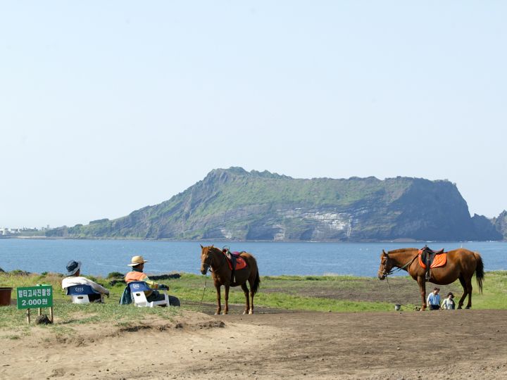 “城山日出峰”是10万年前海底火山爆发而形成的巨大岩石山,是济州岛的代表名胜之一。从峰顶眺望美丽的日出,这是济州岛十大绝景之一。99个岩峰像围城般将火山口环绕,内侧形成了10万多平米的广阔草原。“城山日出峰”海拔182米,通往峰顶的沿路上设有台阶,从入口开始往返大约需要1小时,站在山顶眺望,能给人一种叹为观止的美妙感觉。西北面是草坪山脊,是供游客散步的地方,可以在那享受骑马的乐趣。从著名景点涉地岬乘车只需10分钟路程。