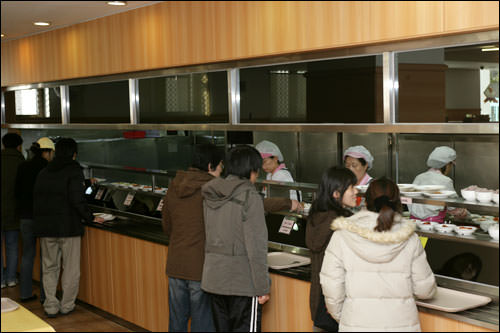 这座6层建筑的学生会馆1层是学生食堂,2层是售卖紫菜包饭、拉面、辣炒年糕等的美食街,3层以上的楼层里设有100多个社团活动室。学生会馆前广场是学生们课间休息的场所。