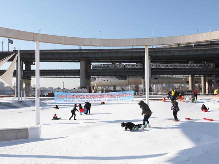 寒冷的冬天到首尔旅行可以去哪玩儿呢?滑雪、滑冰、滑雪橇是冬季三大户外运动,比起需要提前预订且路途遥远的滑雪,很多首尔市民会就近选择市里的滑冰场或雪橇场一享冬季运动的乐趣。今天就介绍一下首尔市内最具人气的雪橇场之一——汉江公园的纛岛雪橇场。汉江公园纛岛雪橇场内有大型(大人,80米,倾斜11度)和小型(儿童,30米,倾斜8度)滑坡。夏天这里是游泳池,到了冬天摇身一变成为了雪橇场。雪橇场内有玩雪乐园、休息设施、游乐设施(迷你火车、旋转木马等)、钓冰鱼(另加5,000韩元)体验等各种便利设施和体验活动。