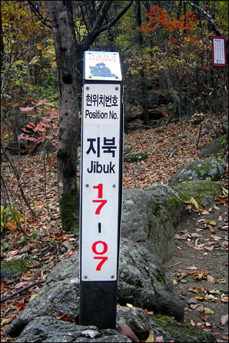 韩文下方的“Jibuk”(意为智北,即智异山北部),另外还有“智南”、“智异”等,表示此路标的所在位置。上方的数字表示登山路线编码,下方的数字表示登山口至现位置的距离。用数字×500m,即可得知距离。以本图为例,7×500m,表示从登山口到现位置约为3,500m。路标侧面标有公园办公室、救护中心的电话号码。