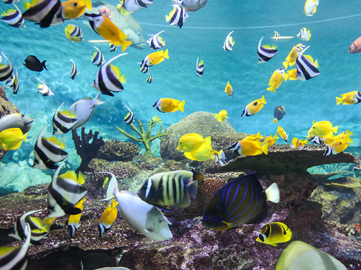 热带和亚热带的河口地区水汽充足、森林茂盛。小型的鲨鱼、鳐鱼、漂浮的河豚在水族馆上方游动。色彩鲜明的埃及神仙鱼和有毒的虎皮鱼等大海栖息的热带鱼类种类繁多。