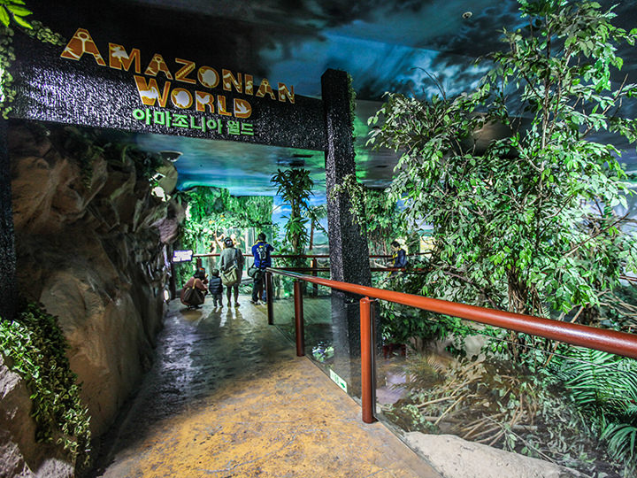 在以亚马逊热带丛林为原型设计的森林中,您可以观赏到世界最大的淡水鱼群巨骨舌鱼和电鳗,水边生活的动物鳄鱼、水獭以及蝙蝠、松鼠猴等。