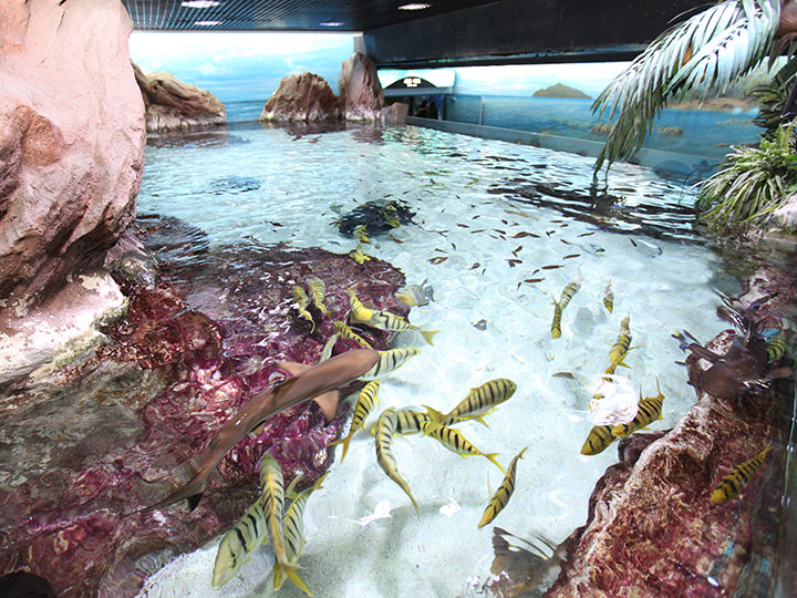 “深蓝广场”展厅中饲养着大群沙丁鱼,它们会随着梦幻般的音乐起舞。往旁边走,您可以看到供游客参观学习的海星及贝类水槽,您可以触摸它们并拍照留念,另外,该区还有出售零食和饮料的角落,如果您和家人一同前来游玩的话,可以在此处好好休息。