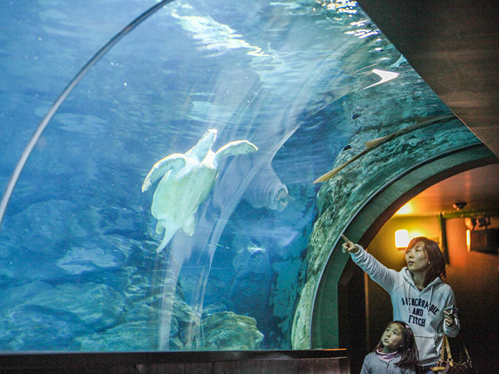 海底隧道中您可以随着移动步行传送带边行进便观赏,海龟、鲨鱼直逼眼前的视觉冲击,着实扣人心弦。