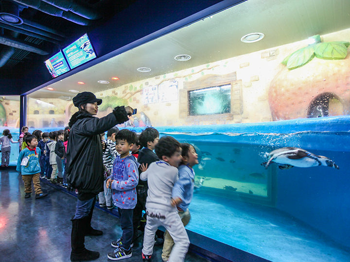 在企鹅水槽,您可以看到约20只圆滚滚的企鹅撒娇搬的一个接一个潜入水里,十分可爱。