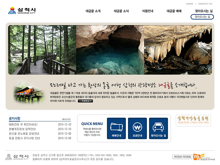 江原道三陟市大耳里秀丽的山间有一条美丽的小溪,溪水四季潺潺不绝,追根求源,人们便发现了深藏在山中的大金窟。这座于2000年发现的洞窟,总长1,610米,仅仅是挖掘和开发,便耗时4年,之后建立各项设施又耗时3年。历经7年的准备,这个美丽的天然洞窟终在2007年6月得以对一般游客开放。如同大金窟之名一般,洞窟中到处可见熠熠夺目的金黄色钟乳石、石笋和石柱。不详其源的洞窟水穿流其中,形成了许多大大小小的自然瀑布和洞窟湖,美不胜收。韩国旅游途中,有机会的话到神秘的地下世界来次清凉之旅吧!
