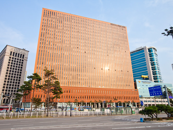 首尔站站前非常显眼的位置上有一座标志性橙色建筑,这就是大名鼎鼎的首尔广场大厦,这里是有众多美食店的大型综合购物中心,聚集了大约30家美食店。从这里前往首尔站,来往仁川机场都是十分方便的。