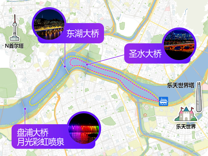 ▪盘浦大桥月光彩虹喷泉秀受雨天、汉江水位等因素影响,有时会停止运行。含有喷泉秀景点的航线无法保证一定能观看到,敬请谅解。