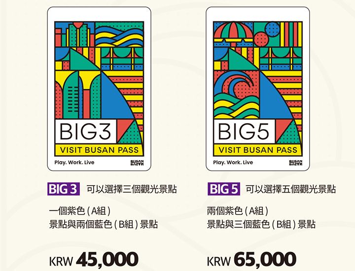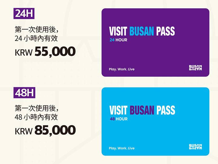 | 所含服務 | 釜山通行證實物卡,手機PASS( 可免費參觀通行證合作景點40處※以後可能會有增減; 實物卡可充值後用作交通卡 ) |