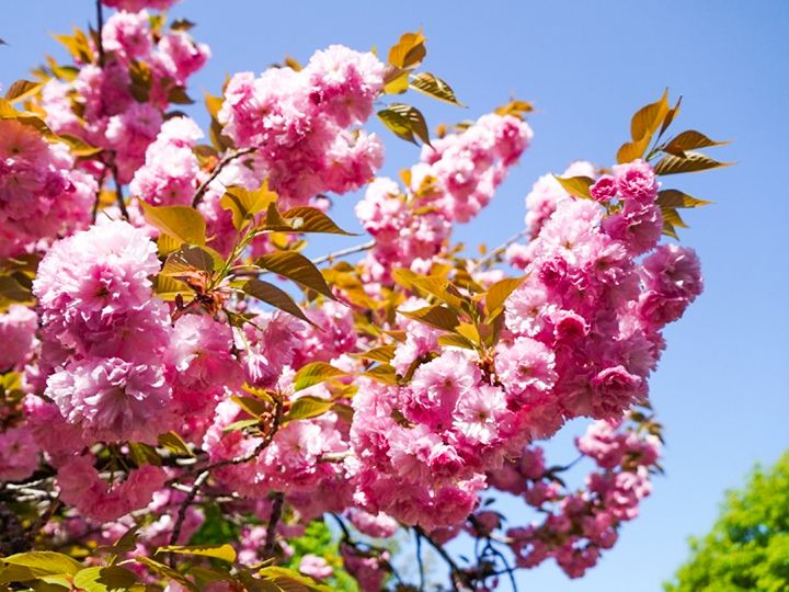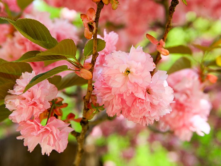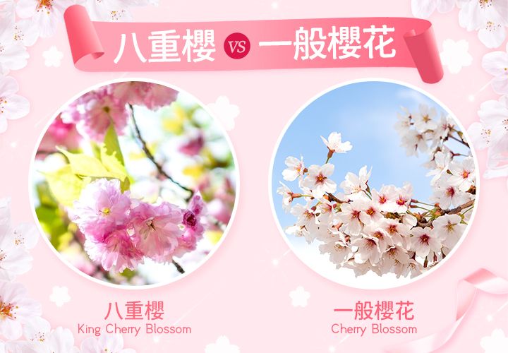 ▪ 八重櫻和普通櫻花的區別主要在外形和開花期。八重櫻比一般櫻花要大一些,花瓣是重瓣,花的顏色更接近深粉色,而開花時間要比一般櫻花遲一些,4月中下旬才是它們的鼎盛期。